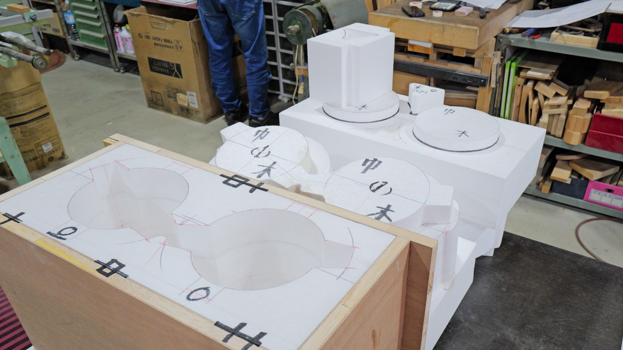 発泡スチロールを使用した型も手作業で制作いたします。低コストが利点で、一度きりの製造や試作品の製造に適しています。